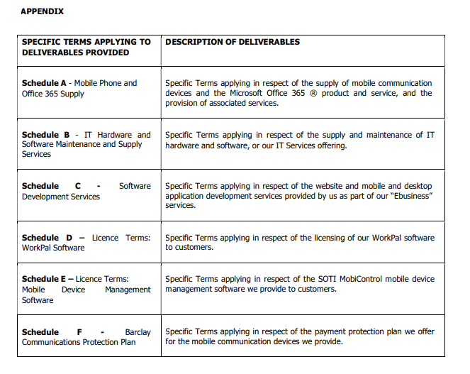 2.1 The following terms shall have the following meanings in these General Terms and the Specific Terms (unless otherwise defined therein): “Appendix” means the appendix to these General Terms; “Business Day” means any day which is not a Saturday, Sunday, bank or public holiday in Northern Ireland;